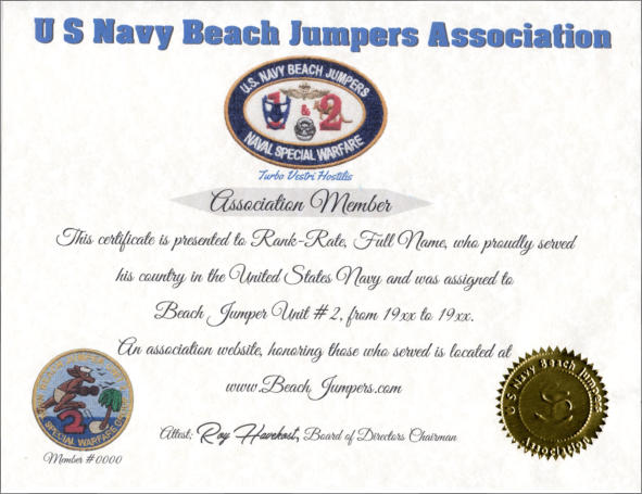 It should be noted that neither the unit 1 or unit 2 patches nor the association patchdesigns were never trademark registered. Several online companies have copied thesedesigns and offered items for sale online using the designs. The Navy Beach JumpersAssociation does not receive any compensation from these sales. If you place an orderwith them, we cannot be held responsible if you are not satisfied with the product.