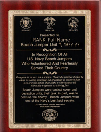 How to purchase:1. Email admin@beachjumpers.com and request an order number. ( You must be a member in good standing, duespaid for current year. )2. Include in the email request your rank/rating, full name, unit assigned to and years assigned. Also includemailing (shipping) address where you want the plaque sent.3. Mail a check or money order toU.S. Navy Beach Jumpers Assoc. 357 Sparrow Branch Circle Saint Johns, FL 32259-4543Effective Aug. 6, 2024:Payment in the amount of $125.00 includes the personalized engraving.Shipping and handling (x-tra) UPS to be determined Please include the order number from admin on the memo line.4. Please allow two-three weeks for delivery, from the time we receive your check or money order.5. PLEASE INCLUDE YOUR ASSOCIATION MEMBER NUMBER WITH ALL ORDER CORRESPONDANCE.